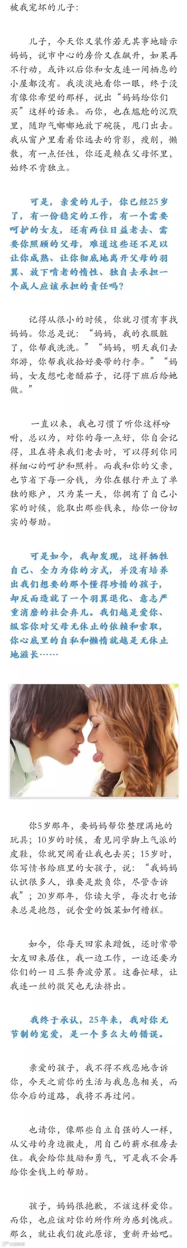 中国妈妈爱孩子在这个世界上是数一数二的。从孩子上幼儿园、上小学、上中学、上大学,到找工作、结婚、生孩子,妈妈无时无刻不在操心–即使为孩子把心操碎了,她们也毫无怨言。殊不知:“心软是害,狠心是爱。谁溺爱孩子,谁总有一天会为孩子包扎伤口。”