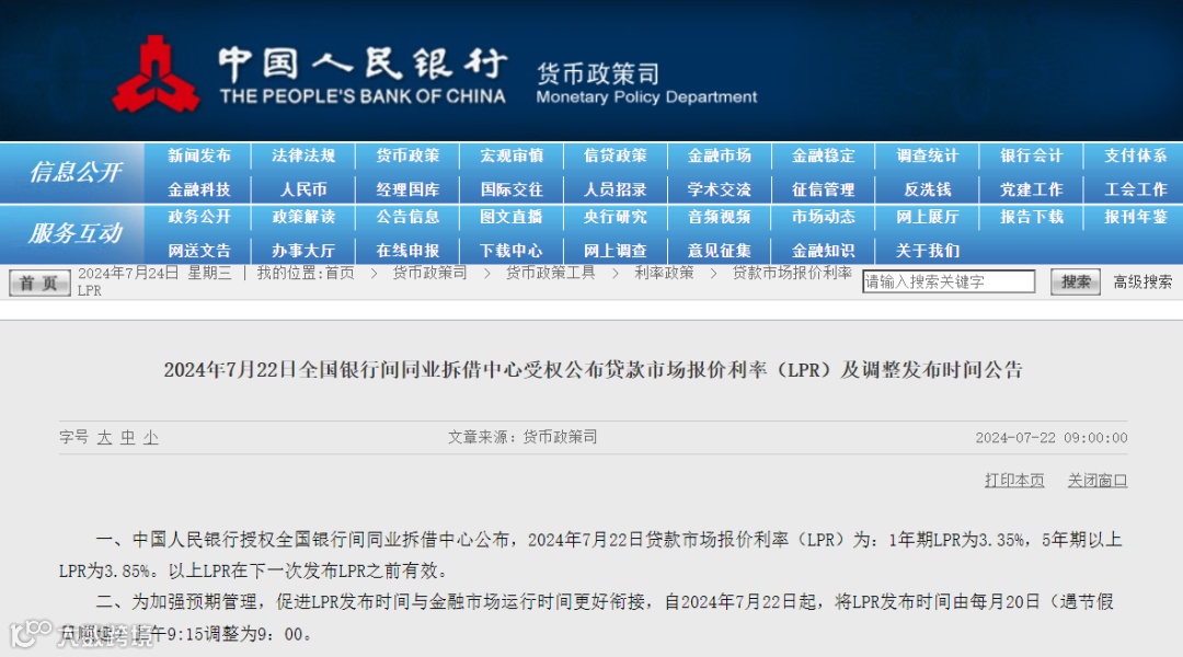 7月22日,中国人民银行授权全国银行间同业拆借中心公布最新贷款市场报价利率(LPR),其中1年期LPR降至3.35%,5年期以上LPR降至3.85%,均较上一期下降10个基点。