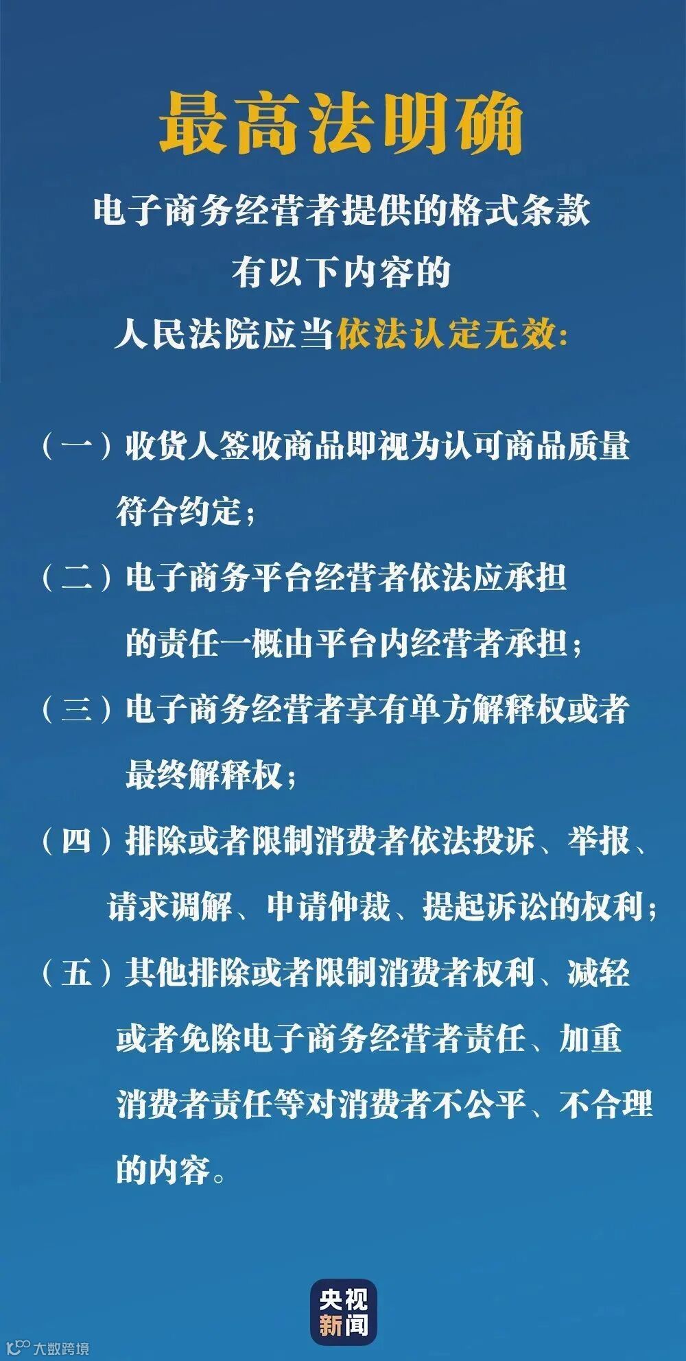 最高人民法院民一庭庭长郑学林表示,《规定》第1条对于“签收商品即视为认可商品质量合格”“经营者享有单方解释权或者最终解释权”等实践中常见的不公平不合理的格式条款进行了列举,明确有上述内容的格式条款应当依法认定无效。