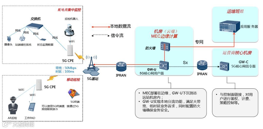 在城市中心配电房与开闭站.运维班组所辖区域部署5G网络,实现对配电房、开闭电站控制系统、视频和状态监测数据、机器人巡检的实时远程监视和控制,同步实现移动操作和AR巡检,通过5G网络实时回传移动终端现场巡检数据和远程会诊。网络要求:带宽50M,时延100ms。
