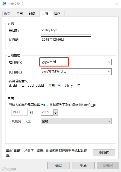 将下图中红框内的字母修改为【yyyy/M/d/dddd】: