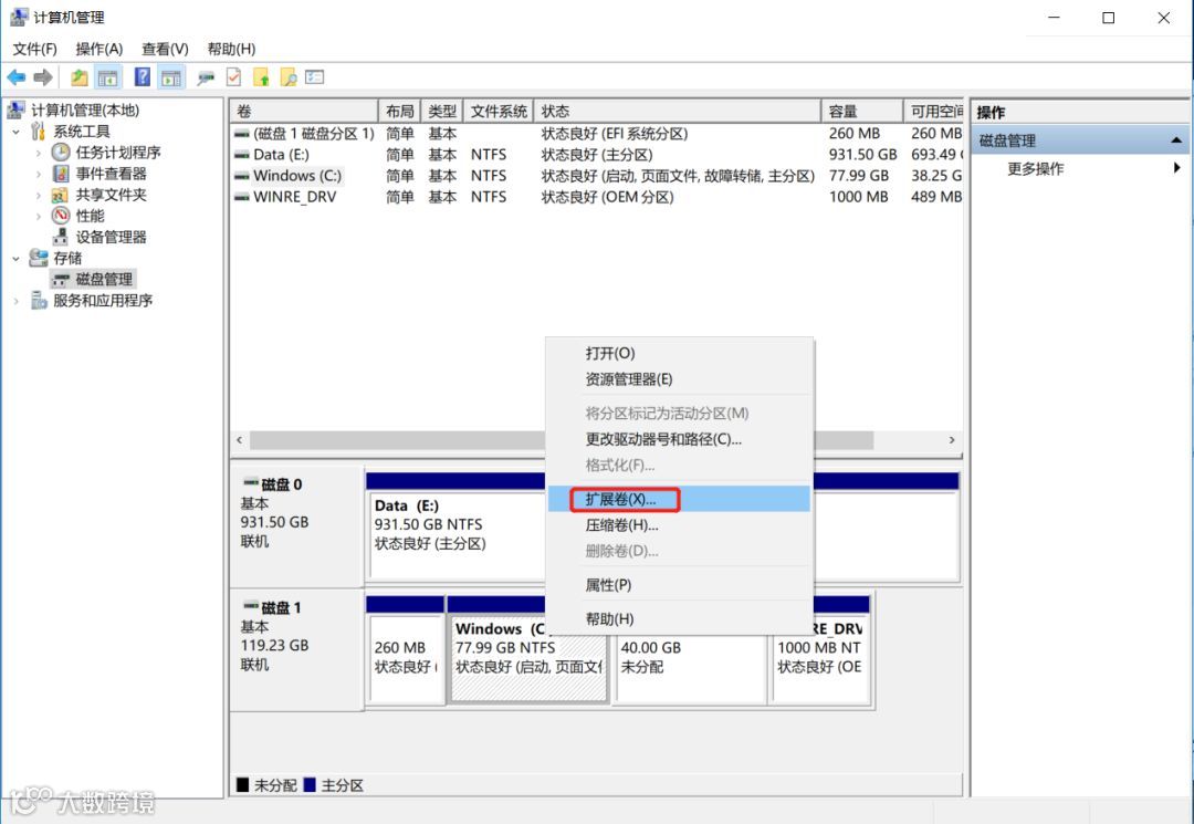 1:右击“C盘”—“扩展卷”,就可以打开扩展向导了。
