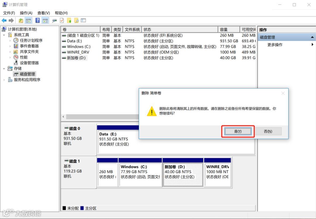 3:如果已经备份了电脑所有数据,点击“是”,将D盘删除即可。