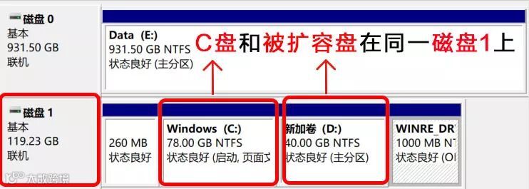 结论:可以将D盘扩容到C盘,不可将E盘扩容到C盘。