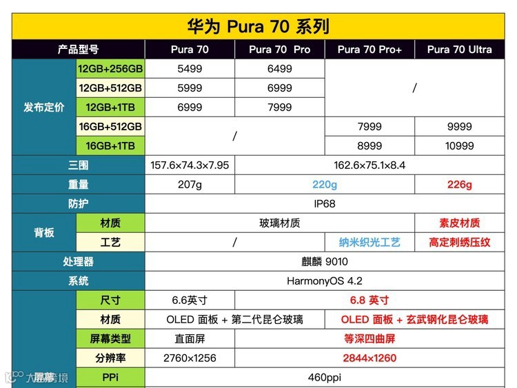 简单的一个华为 Pura 70 系列参数对比图,大家可以快速对比指标差异。