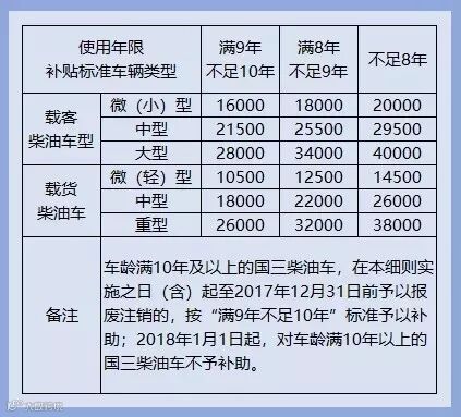 从表里可以看出:满8年不足9年的话,小型载客柴油车补贴是18000,而满9年不满10年的补贴就变成了16000,这里有2000块的差价。所以,卡友们可要好好了解、计算这个时间。