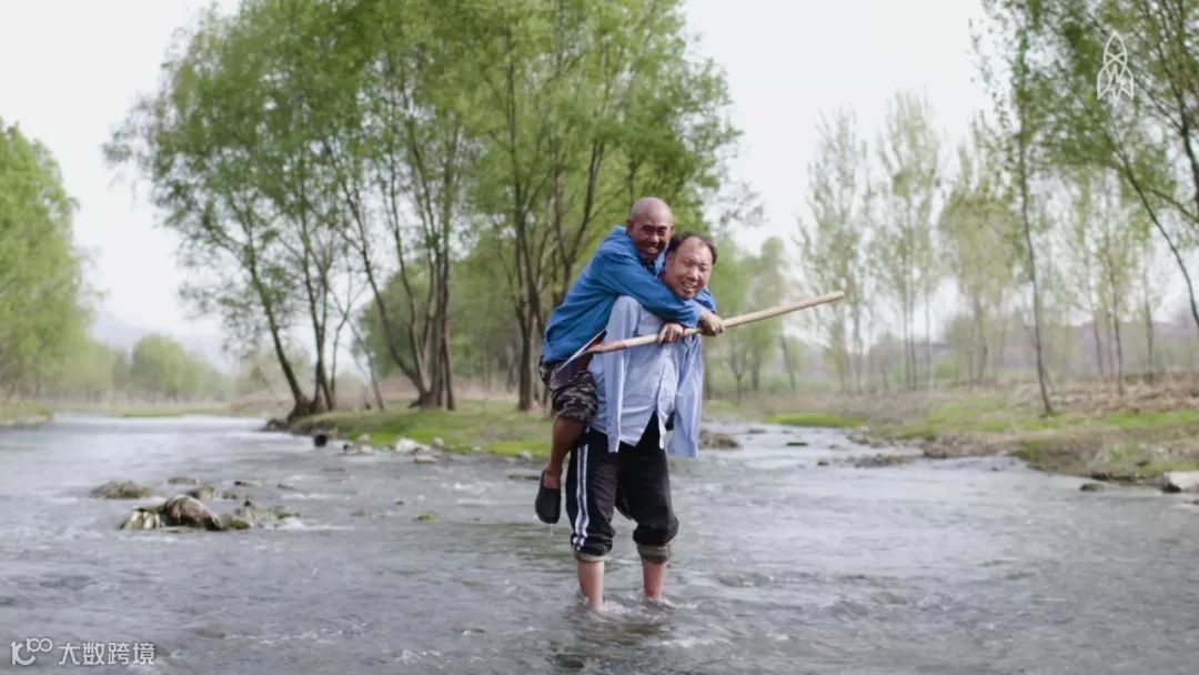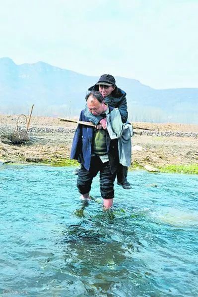 过河时,贾海霞帮贾文其卷起裤腿,贾文其就背上贾海霞趟过去。