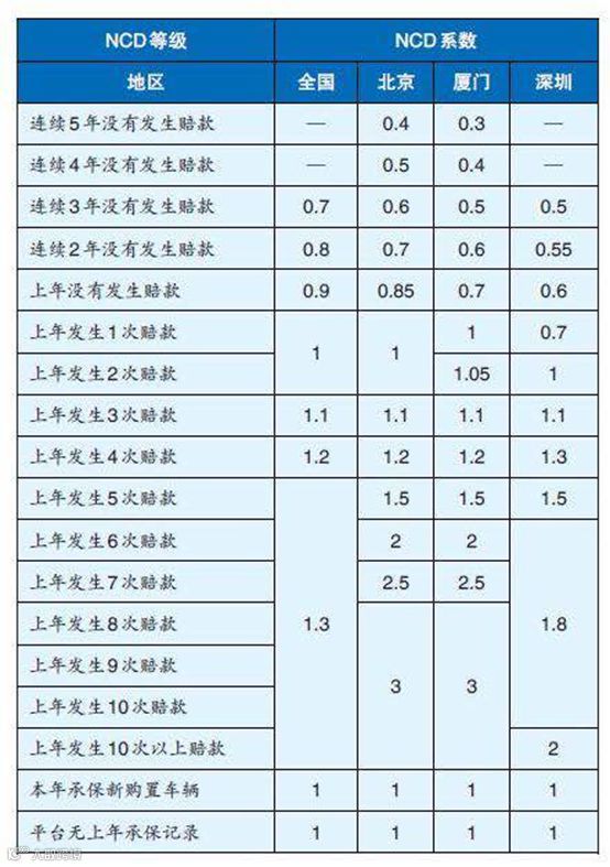 在保费的计算公式中,自主渠道和自主核保系数都是保险公司自己设定的,今天重点说说这里一个非常重要的系数叫做NCD系数,这个系数咱们可以简单理解成,出险次数对应的折扣,我们可以看下这个表格。