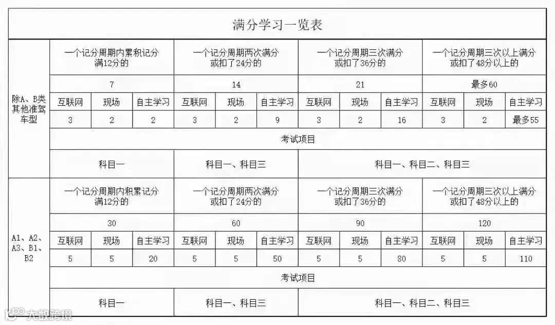 其中,大型客车、重型牵引挂车、城市公交车、中型客车、大型货车驾驶人在一个记分周期内参加满分教育的次数每增加一次或者累积记分每增加12分,道路交通安全法律、法规和相关知识的学习时间增加三十天,每次满分学习的天数最多一百二十天。
