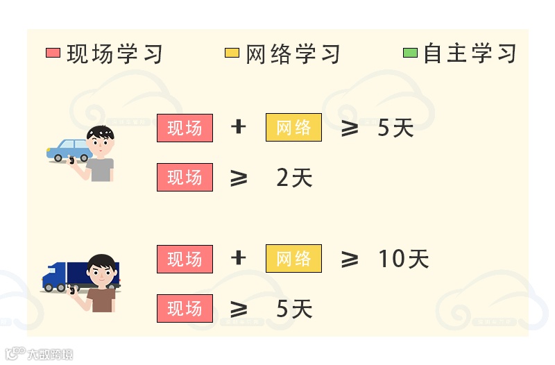 大型客车、重型牵引挂车、城市公交车、中型客车、大型货车驾驶人参加现场学习、网络学习的天数累计不得少于十天,其中,现场学习的天数不得少于五天。满分学习的剩余天数通过自主学习完成。