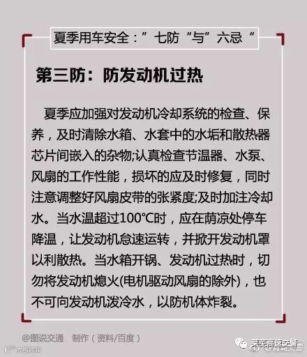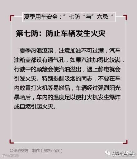 夏季是交通事故频发,同时也是一年当中对安全行车来说最具挑战的一个季节。为了确保夏季行车安全,朋友们除了要严格遵守交通法规外,还要注意以下这“七防”与“六忌”↓↓↓
