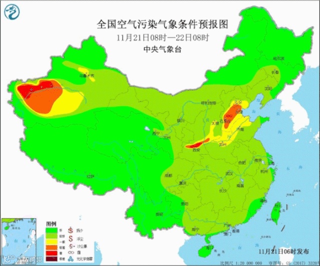 21日至23日,华北中南部、黄淮中西部、汾渭平原等地大气扩散条件逐渐转差,并伴有轻至中度霾,其中22日夜间至23日早晨,局地可达重度霾。此外,21日和22日的夜间至早晨时段上述地区有大雾,局地有强浓雾。