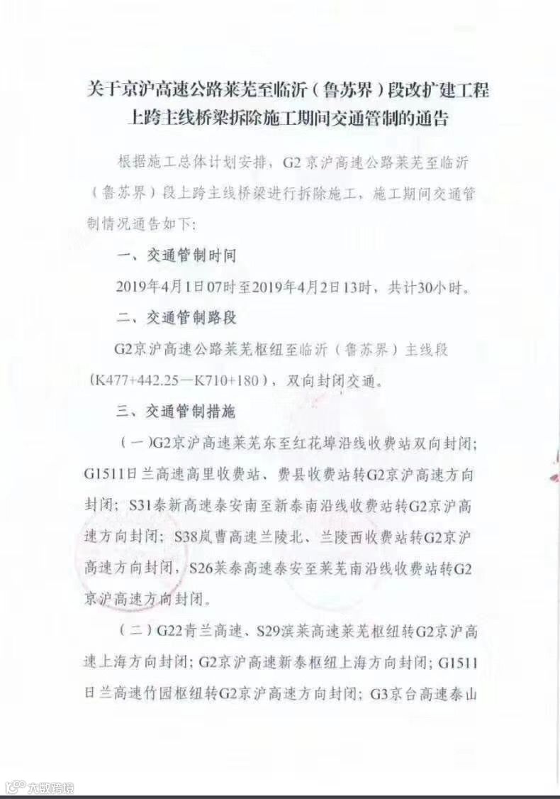 (二)G22青兰高速、S29滨莱高速莱芜枢纽转G2京沪高速上海方向封闭;G2京沪高速新泰枢纽上海方向封闭;G1511日兰高速竹园枢纽转G2京沪高速方向封闭;G3京台高速泰山立交转S31泰新高速上海方向封闭;S26莱泰高速莱芜东枢纽转G2京沪高速方向封闭;S38岚曹高速临沂南枢纽转G2京沪高速方向封闭。