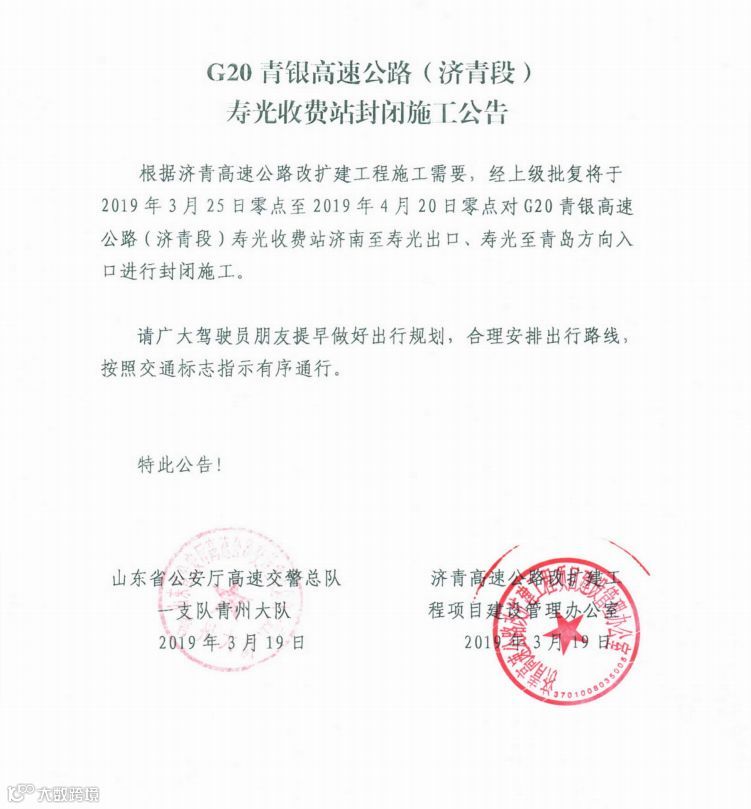 根据济青高速公路改扩建工程施工需要,经上级批复将于2019年3月25日零点至2019年4月20日零点对G20青银高速公路(济青段)寿光收费站济南至寿光出口,寿光至青岛方向入口进行封闭施工。