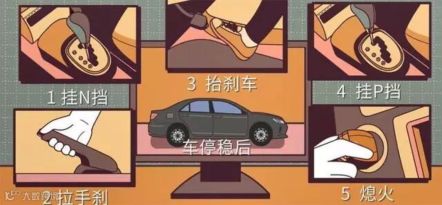 2.踩刹车-挂档-拉手刹-熄火-挂P档(推荐方式)