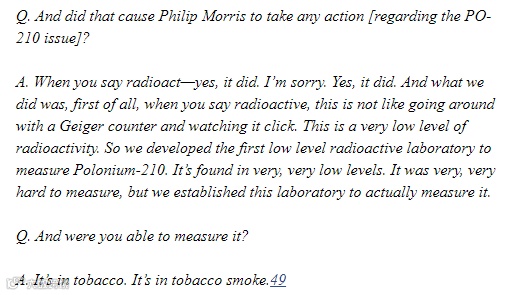 Philip Morris(生产万宝路牌卷烟的公司,曾是全球第一大烟草集团)公司的一位退休副主席证实,其公司和烟草行业早就知道了钋元素的存在,并建立了测量实验室。