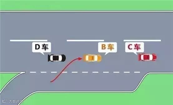 当行车道上的车流密度较小、车辆相距较远时,B车可按以下方法驶入高速公路。