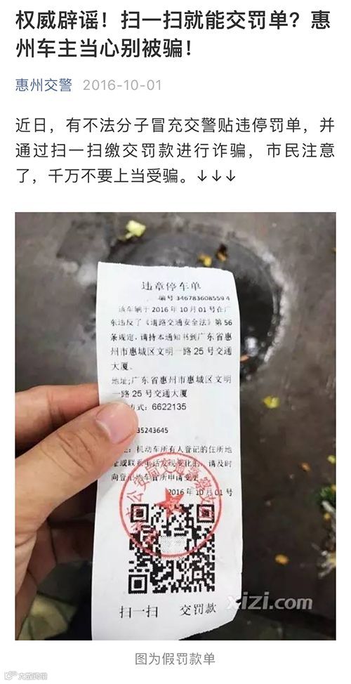 2016年国庆期间,惠州交警就发布了一条微信消息称,"近日,有不法分子冒充交警贴违停罚单,并通过扫一扫缴交罚款进行诈骗,市民注意了,千万不要上当受骗。"
