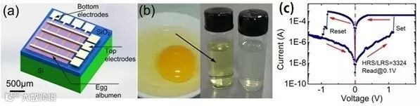 产品利用纯天然鸡蛋白(Egg Albumen)材料和可降解金属研制出生物兼容的可降解非挥发性储存器--忆阻器。该储存器的核心材料是一层30纳米厚的蛋白,上下电极分别由镁和钨薄膜金属构成。改变电极上的电压可以将器件由高阻抗变成低阻抗状态,或反之,达到储存信息的目的。研究表明,此忆阻器可读写数百次,在干燥情况下信息储存三个月而不变。当器件放入水中时,整个器件在3天时间内几乎完全溶解于水,仅留下少许的痕迹。这项研究为未来植入人体的各类电子系统提供了技术基础。
