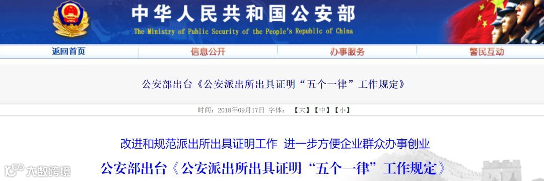 9月17日,公安部官方网站发出通知《公安派出所出具证明“五个一律”工作规定》,目的是为解决社会反映强烈的“奇葩证明”问题和个别部门随意要求群众到派出所开具证明等问题。据悉,公安部已于日前将《规定》印发全国公安机关,并要求各地结合实际认真贯彻执行。