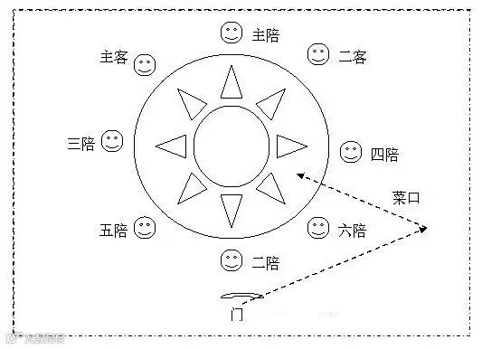 外地的朋友若不清楚其中原委,告诉你个简单的方法:只要看桌子上杯中餐巾的叠法就可以分辨出来。这两个位置的餐巾的叠法是与众不同的。主人的餐巾一般是折叠成圆筒形状,插在杯子里面的。而主陪的餐巾则是叠成扇面状的。其位置的餐巾则是一般的三折呈花瓣状。整个餐巾的布局有点象是展翅的凤凰。定好了这两个位子,别的位置就好确定了。坐在主人左面的是“主宾”,右面的是“次宾”;相对应的,左面挨着主宾的是“副主陪”,右面挨着次宾的叫“次陪”,但叫“三陪”的多。其余的位置宾主可以随便坐,酒桌上戏称这些人是“不三不四”,原因是酒桌上没有“三宾”、“四陪”的叫法。