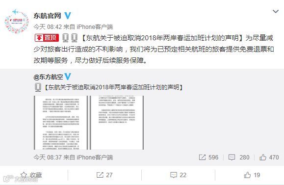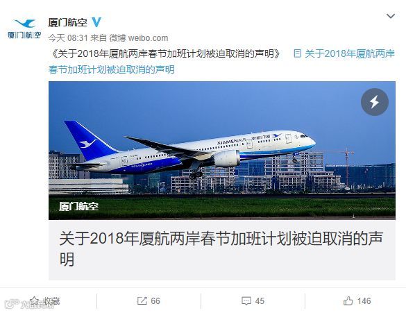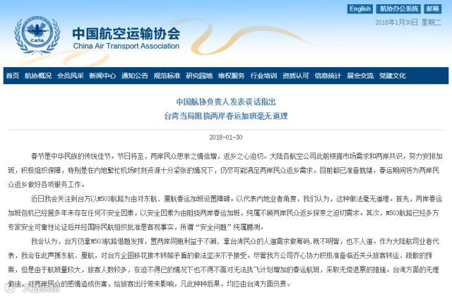 今日(30日),东航和厦航分别在微博上发表声明,批评台当局不顾两岸人民利益。同日,中航协也发表声明,声援东航、厦航不予接受台当局转移矛盾的做法。