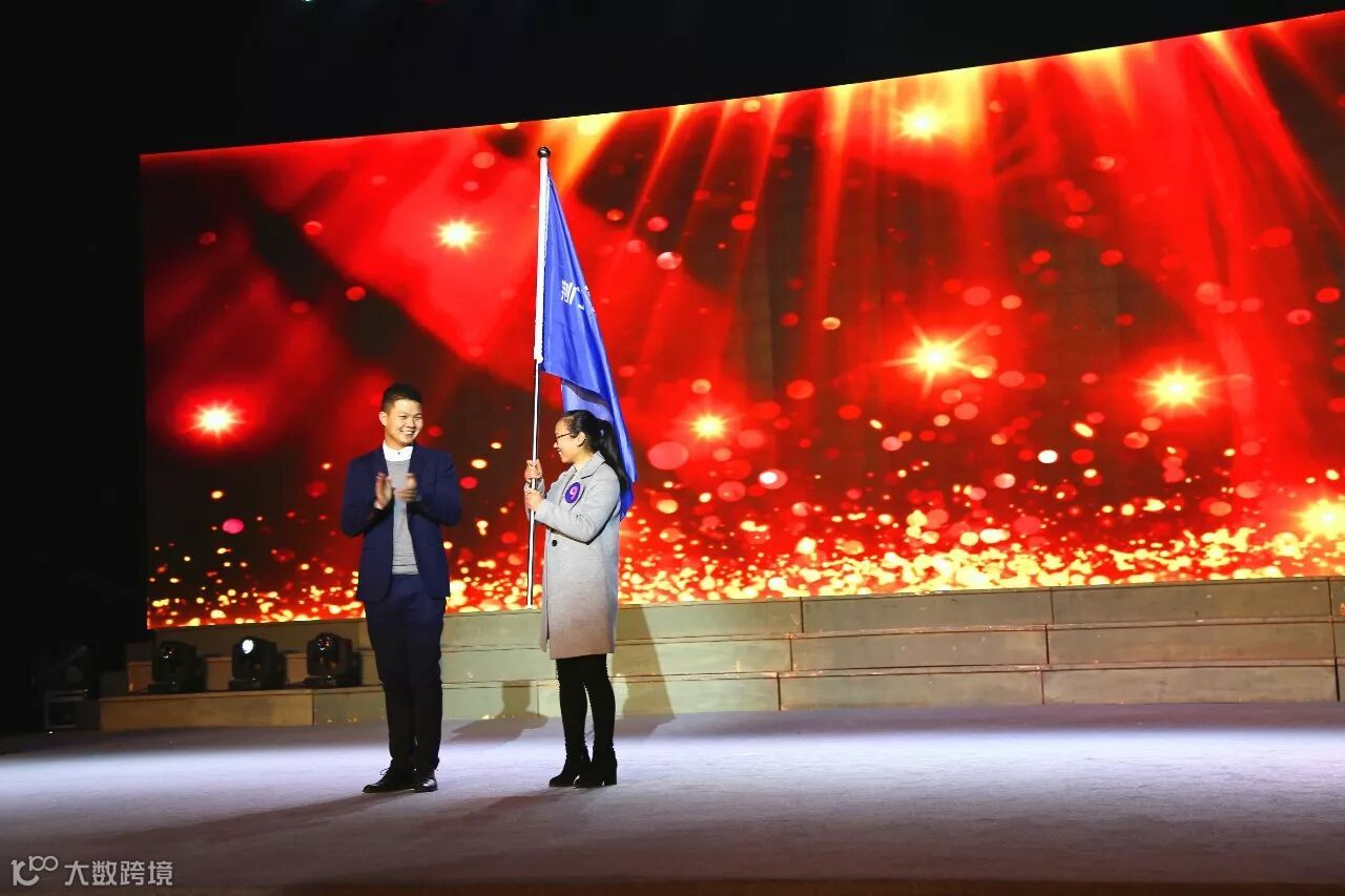 随后进行授旗仪式,第二届冠军闫岩上台,将代表着大赛精神与意志的大赛旗帜传递给本届大赛冠军孙佳怡。