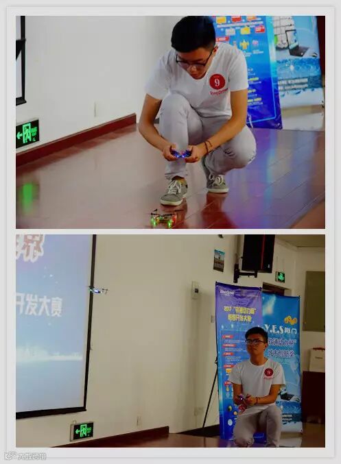 Duang!Duang!Duang!声称要做无人机的同学来啦--基于传感器定位的跟踪飞行伞,当无人机盘旋在决赛场的上空时,现场评委和学生一片掌声、欢呼声。