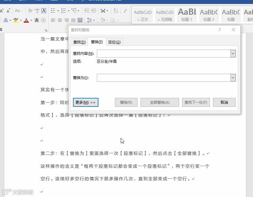 这样操作的含义是“每两个段落标记都会变成一个段落标记”,两个空行变一个空行。连续好多空行的情况下就多操作几次,直到全部变成一个空行。