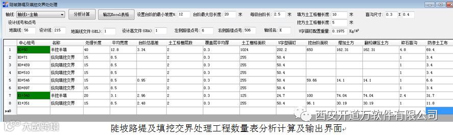4、陡坡及填挖交界处理,可自动分析全线半填半挖、纵向填挖交界段落,根据填写的台阶参数、土工格栅参数、盲沟参数计算陡坡及填挖交界处理工程数量,并且输出标准格式的EXCEL表格;