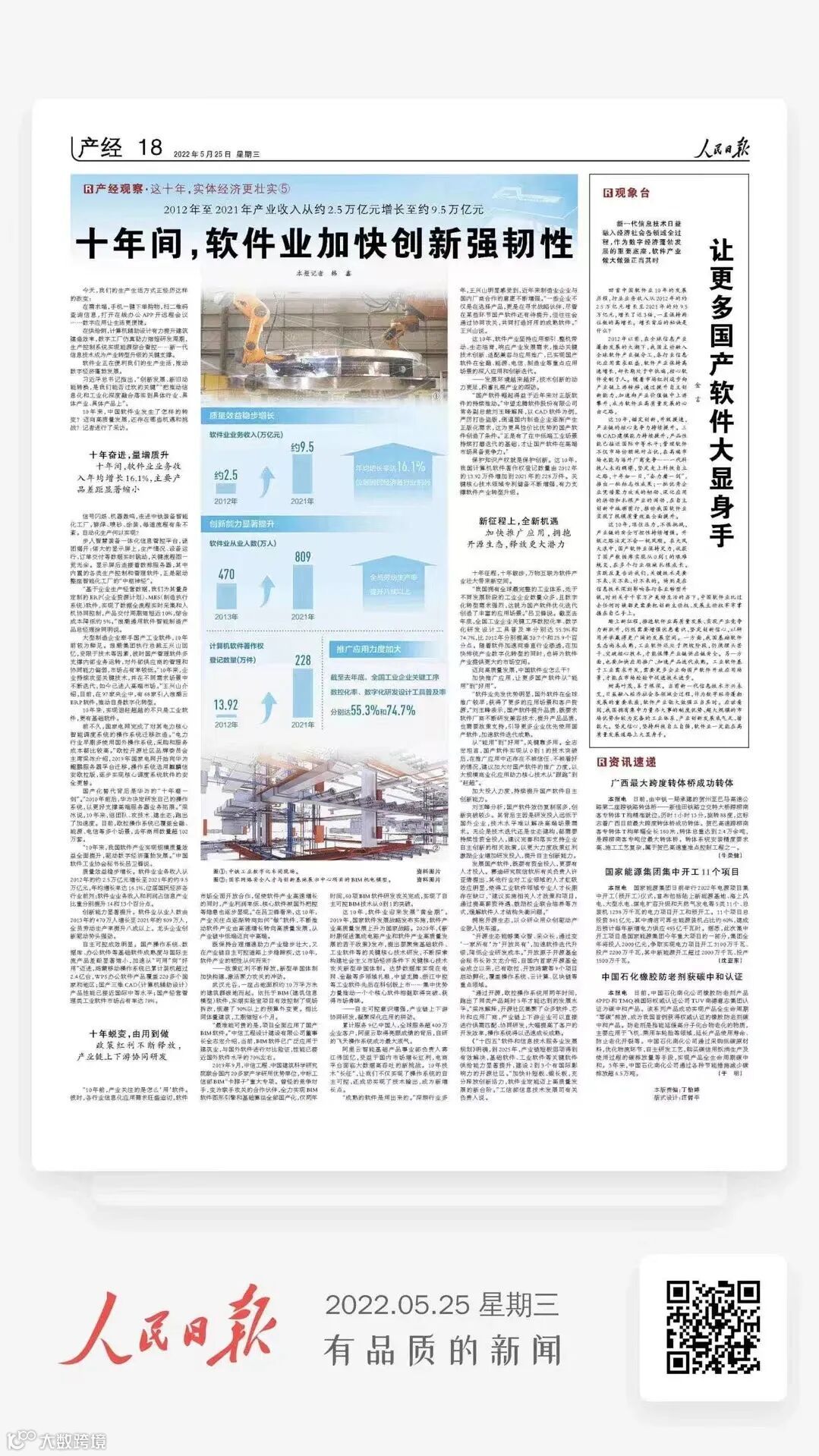 5月25日,《人民日报》刊发《十年间,软件业加快创新强韧性(产经观察·这十年,实体经济更壮实⑤)》文章,对我国软件业十年发展成效进行报道,引用了浪潮集团执行总裁王兴山的观点,以及浪潮工业软件服务中铁工业的创新实践。以下节选报道相关内容。