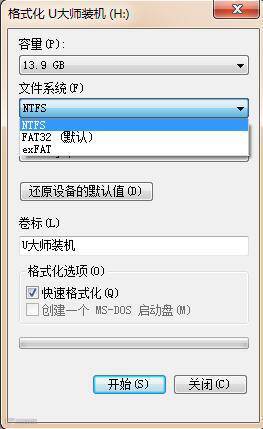 3、在文件系统中选择NTFS格式,然后点击“开始”,进行格式化。