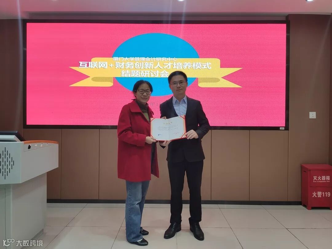 最后,周永祥总代表厦门铸远集团有限公司向项目负责人郭晓梅教授颁发2018年第一批教育部产学合作协同育人项目《互联网+财务创新人才培养模式》结题证明。