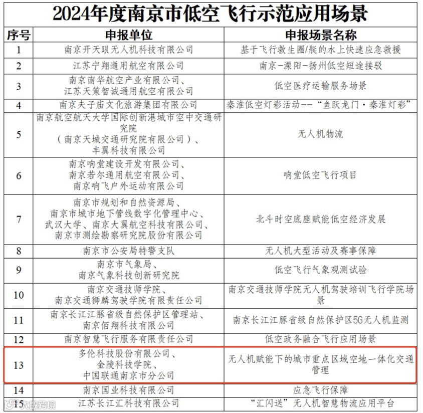 2024年底,南京市交通运输局会同南京市低空飞行服务中心,秉持打造标杆、突出创新、强化引领的原则,向全社会公开征集2024年度低空飞行典型示范应用场景,多伦科技成功入选。