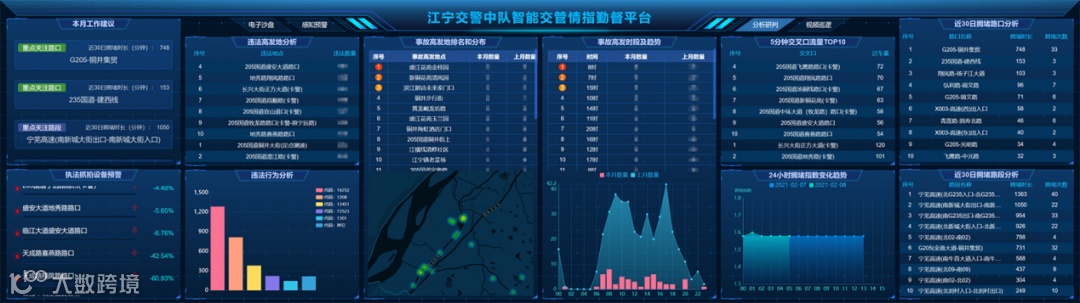 平台可对辖区内交通违法、交通事故、交通流、互联网路况、警情等数据,进行综合研判,深度挖掘警情高发时段、地点、行为、成因等特性,并自动生成当月勤务工作建议报告,助力每月勤务工作的精准制导。