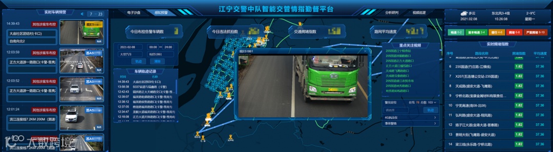通过采集互联网实时路况,结合专网流量检测器微观数据,进行融合计算分析,实时感知辖区交通路况。当发现交通拥堵警情时,可调取周边视频监控、信号灯实时状态和警力定位信息,核实拥堵事实情况、查明拥堵成因后,进行拥堵干预调度。