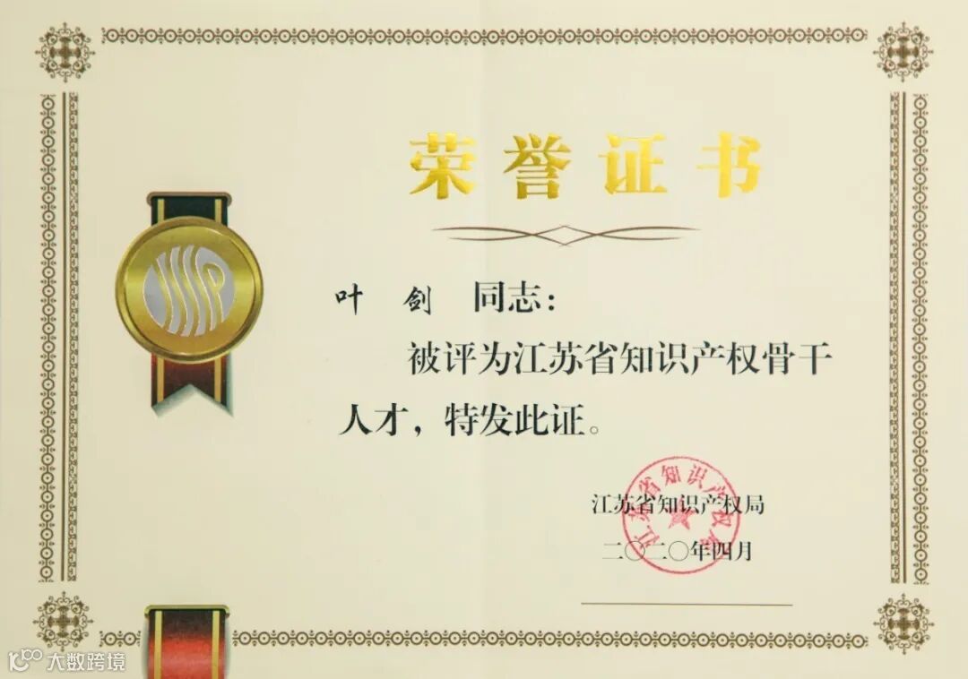 知识产权人才是科技创新的护卫队。叶剑博士获评“省知识产权骨干人才”,说明了他具备较高的知识产权综合素质,能带领并组建优秀的知识产权团队,并发挥带动引领作用。
