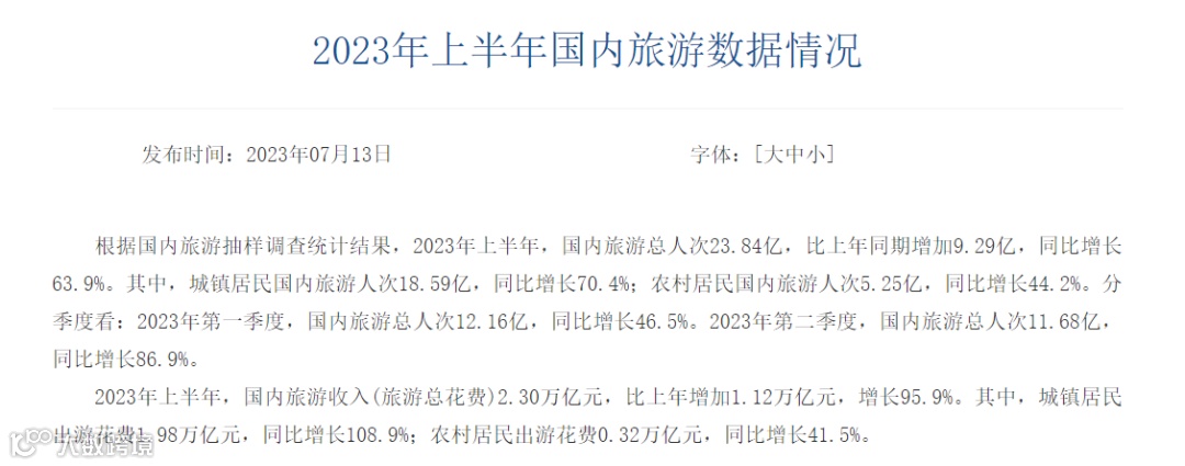 文化和旅游部发布的《2023年上半年国内旅游数据情况》显示,上半年,国内旅游总人次23.84亿,比上年同期增加9.29亿,同比增长63.9%;国内旅游收入(旅游总花费)2.30万亿元,比上年增加1.12万亿元,增长95.9%。在提振消费的过程中,旅游已经不再是狭义的“吃住行游购娱”,以“旅游”为纽带,融合消费百业,激活数亿需求的“大旅游消费时代”即将来临。