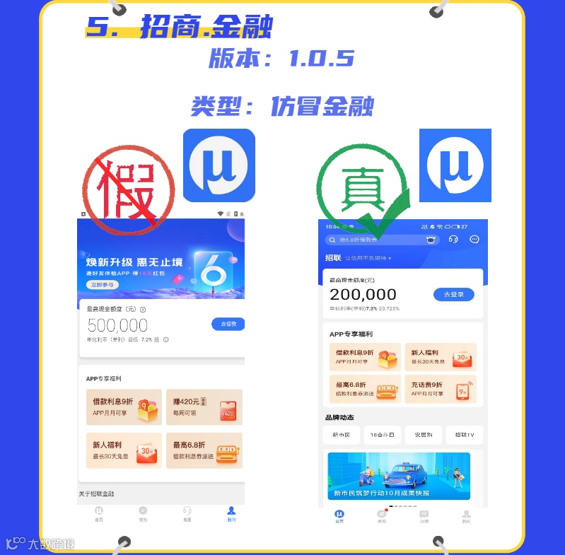 从上图我们可以看出,光是《京东金融》,就有多个仿冒App。虽然此类App为了避开监管,在名称上与官方正版会有一些差异,但是它们都沿用了正版的logo形象元素作为软件图标进而混淆用户,用户一般难以分辨。不同的是,为了节省开发成本,避免穿帮,此类仿冒App往往会以最直接的方式诱导用户注册以及申请贷款,如果用户的资金需求较急,很容易就中了他们的圈套。另外,本次新型涉诈App中还出现了xx金融平台极速版的形式,而金融平台官方并未在正版应用商店上架此类极速版本。此类仿冒App往往利用用户图方便省事的心理实施金融诈骗。