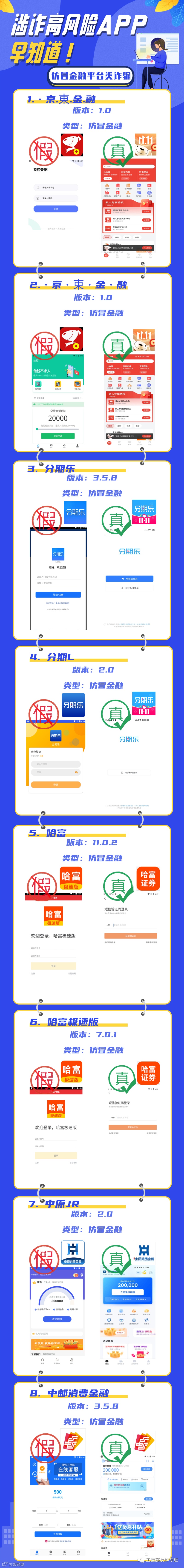 除了上面分析的几款仿冒《京东金融》和《哈富证券》的手机App,工信部还披露了其他几十款仿冒各家金融机构的涉诈App,今天东融金服给大家整理了一份金融机构类最新涉诈APP名单,大家一起来看看吧。