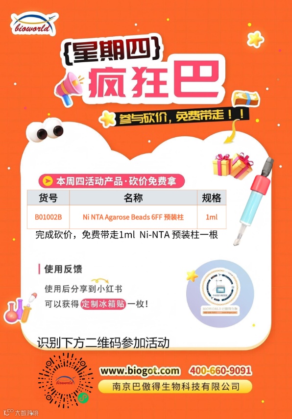 宝子们!周四“疯狂巴”又双叒来撒福利啦~这次直接放大招:砍价免费抱走「Ni NTA Agarose Beads 6FF预装柱」!科研经费省到就是赚到,手慢无的节奏,速看👇