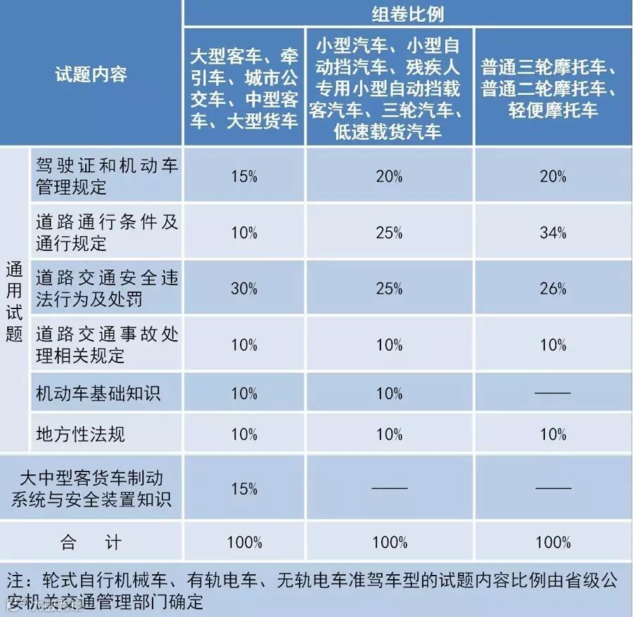 根据公安部、交通运输部《机动车驾驶培训教学与考试大纲》要求,调整相关考试内容:科目一涉及安全文明驾驶常识内容全部调整至科目三安全文明驾驶常识考试项目中;调整考试内容比例,提高道路交通安全法律法规、安全文明驾驶知识考题比例,单列文明行车常识、典型事故案例等内容;调整考试操作,如科目三起步、变更车道、靠边停车、超车项目中增加“回头观察”动作,直行通过路口、左右转弯等项目不主动避让优先通行车辆、行人、非机动车的评判为不合格,从细节动作考核安全文明意识。