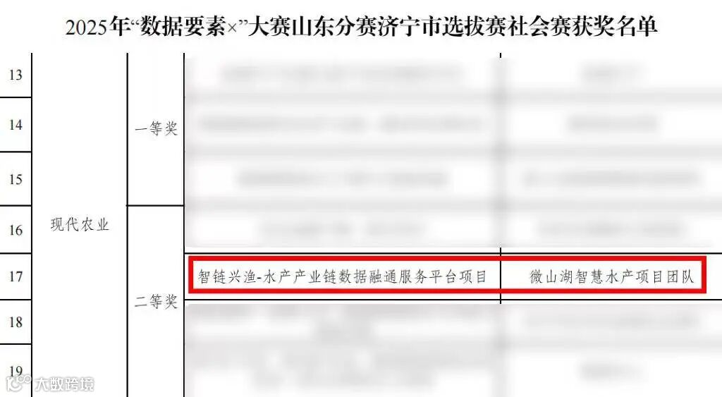 近日,2025年“数据要素×”大赛山东分赛地方选拔赛圆满落幕。浪潮智慧科技两大创新项目在赛事中斩获佳绩,双双获奖并成功晋级省赛决赛。其中,智链兴渔——水产产业链数据融通服务平台项目荣获“数据要素×”大赛山东分赛济宁选拔赛二等奖;浪潮智稷盐碱地综合管理平台则荣获“数据要素×”大赛山东分赛东营选拔赛二等奖。此次获奖充分彰显出公司在农业数字化转型助力海洋经济高质量发展的技术实力与领先优势。
