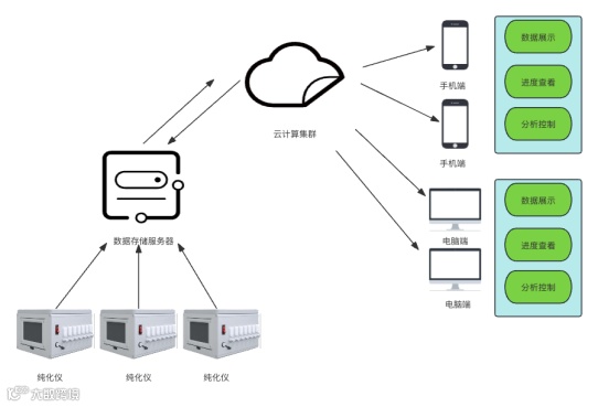 本系统通过小程序连接纯化仪设备,配置实验参数、OD值参数和实验流程参数配置,经过云端计算中心处理后,给纯化仪下发指令开始实验。实验中可实时查看实验过程,进行智能质控。实验完成后可查看洗脱步骤的详细数据。