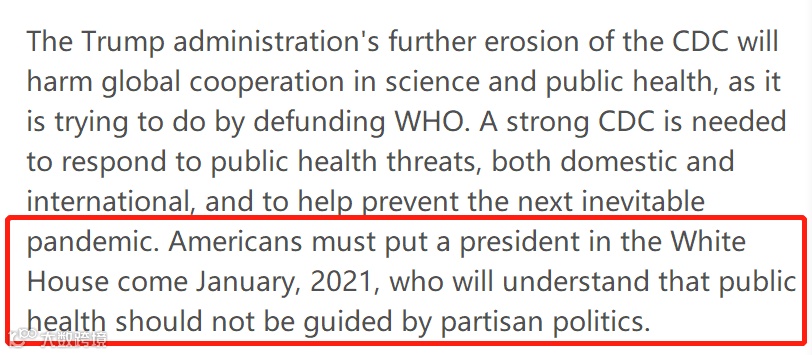 在最后,文章写道:“美国人必须在2021年1月前让一位总统入主白宫,而这位总统需要明白,公共卫生不应受到党派政治的影响。(Americansmust put a president in the White House come January, 2021, who will understandthat public health should not be guided by partisan politics.)”