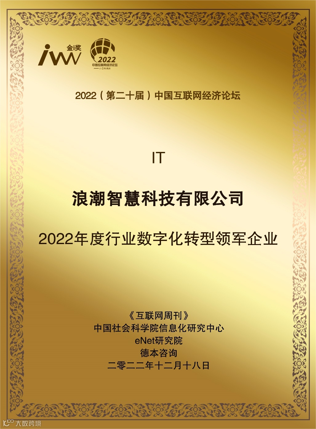 近日,由中国科学院《互联网周刊》、中国社会科学院信息化研究中心、eNet研究院等联合主办的“2022(第二十届)中国互联网经济论坛”线上举行。论坛举办同期,年度“金i奖”评选重磅揭晓,浪潮集团旗下浪潮智慧科技有限公司(以下简称“浪潮智慧科技”)获评“2022年度行业数字化转型领军企业”。