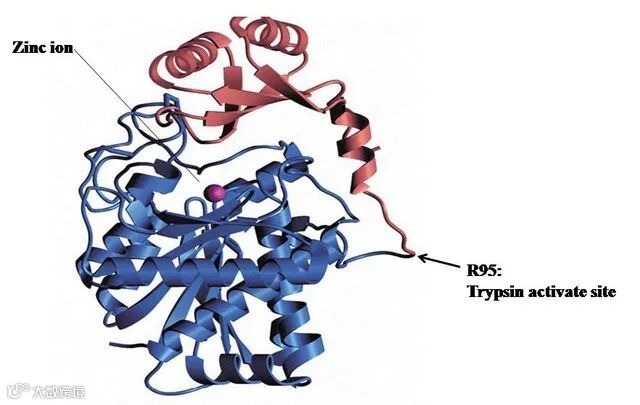 天然存在的羧肽酶B 是由前羧肽酶原B(preprocarboxypeptidase B,preproCPB)经酶解产生,后者 N-末端包含 108 个氨基酸(其中 13 个氨基酸为信号肽序列,95 个氨基酸组成前导肽部分)的多肽片段与 CPB 相连。前羧肽酶原B 在转运到内质网的过程中,信号肽被切掉,得到无酶活性的羧肽酶原B(procarboxypeptiedase B, proCPB)并从细胞中分泌出来,最终在小肠中经胰蛋白酶在 Arg-95 处酶解,成为具蛋白酶活性的 CPB。proCPB 的分子量为 46kD,由 401 个氨基酸组成;CPB 分子量为 35kD,由 306 个氨基酸组成(如图 1)。在CPB 中,前体的活化主要依赖胰蛋白酶在 Arg95 位的切割,半球形前导肽被切割后,它既不会抑制酶体,也不再与之结合,这使得酶体能迅速发挥功能,并对前导肽 C-端的 Arg 进行切割。
