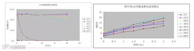 在不同温度下恒温水浴测活底物,使底物的温度分别为 4℃、25℃、30℃、40℃、50℃、60℃、70℃、80℃,取适量 rCPB 纯酶液,测定活力。以 254nm 吸光值 OD254 为纵坐标,时间为横坐标,结果表示见图 4(右)。