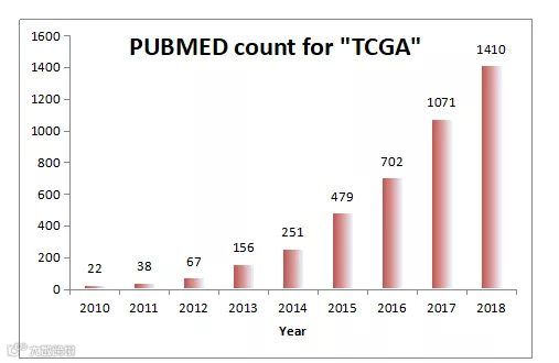 ● 图1 : pubmed数据库检索的包含“TCGA”发表的SCI 文章数量(2018.11.07)