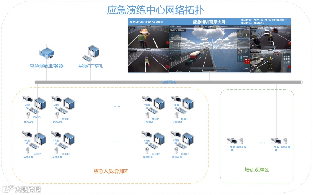 应急演练中心以固定的场所为基础,由计算机网络、高性能PC机、大屏幕、会议音响系统及办公桌椅等辅助设施组成,为培训人员、观摩人员提供与现场环境高仿真、可操控、可交互、沉浸式的应急人员培训场所。